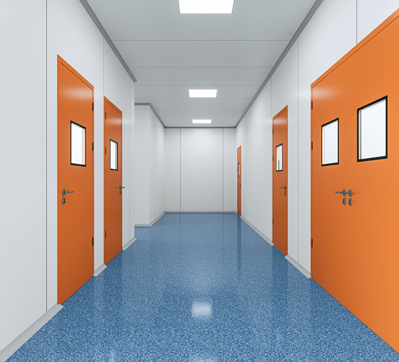 根据《洁净厂房设计规范》车间的墙体和吊顶必须采用不产尘、不积尘表面平滑的材料施工,并且不能在车间中存在死角。采用净化厂房施工专用彩板,基板顶板采用宝钢0.4的钢板,芯材密度达到14kg/m3,铝材采用华联专用铝型材,为提高净化间的使用寿命,并达到美观大方的效果,所有铝型材进行电泳处理。